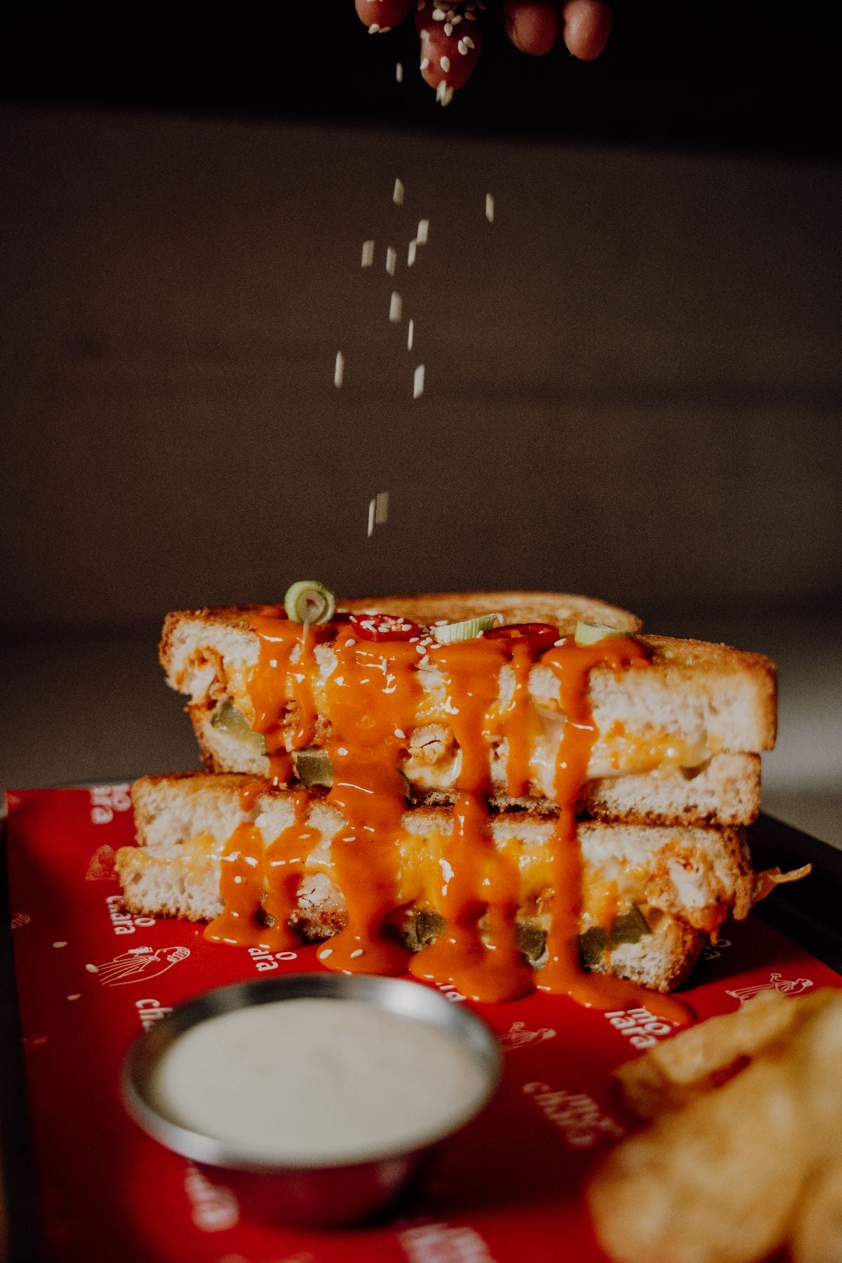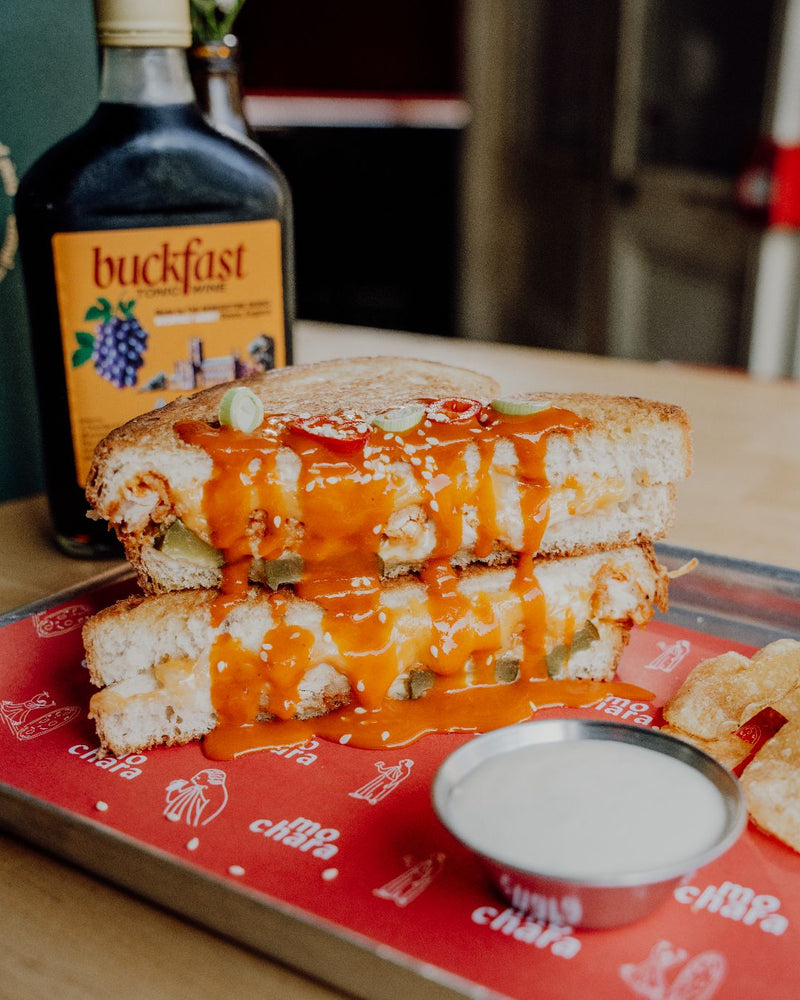 €12BUFFALO BUTTERMILK CHICKEN, THREE-CHEESE BLEND, PICKLES, MO’S CAESAR SAUCE, CAESAR DIP, CRISPS