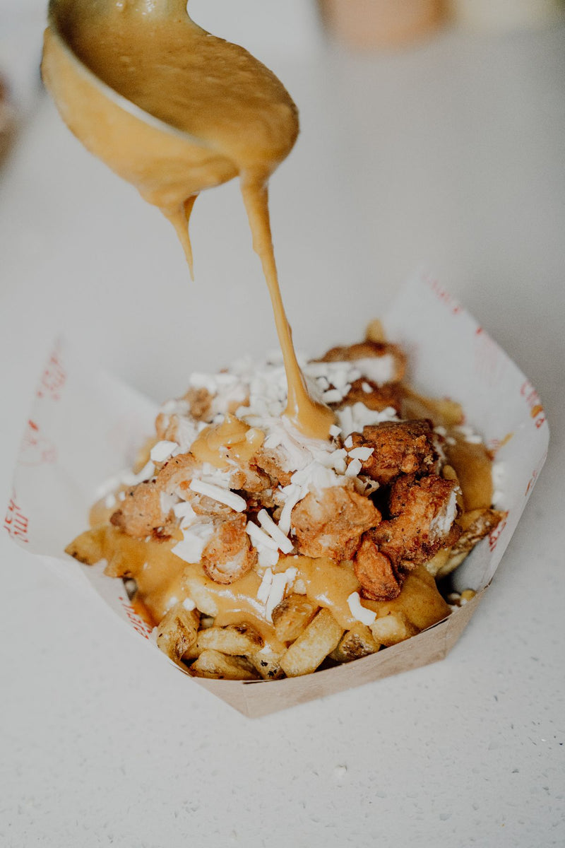 €12.5SING LI CURRY, BUTTERMILK FRIED CHICKEN, HAND-CUT FRIES, THREE-CHEESE BLEND, PARMESAN, EXTRA CURRY & CHIVES, GARLIC MAYO DIP, CRISPS