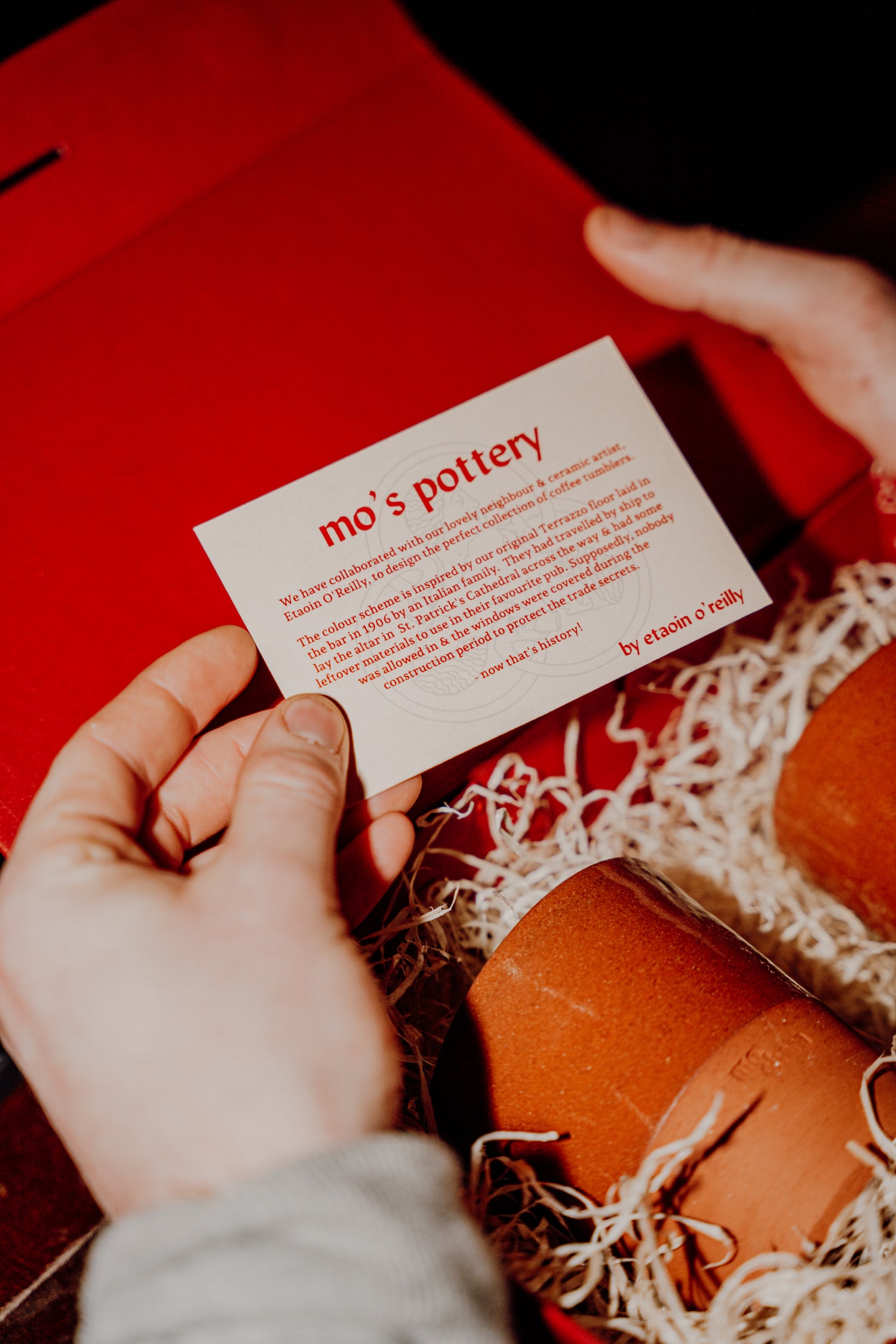 We have collaborated with our lovely neighbour & ceramic artist, Etaoin O'Reilly, to design the perfect collection of coffee tumblers. The colour scheme is inspired by our original Terrazzo floor laid in the bar in 1906 by an Italian family. They had travelled by ship to lay the altar in St. Patrick's Cathedral across the way & had some leftover materials to use in their favourite pub. Supposedly, nobody was allowed in & the windows were covered during the construction period to protect the trade secrets - now that's history!